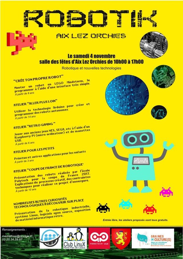 Le samedi 4 novembre, l’association Club Linux Nord-Pas-de-Calais accompagne la médiathèque d’Aix lez Orchies sur l’atelier Robotik de 10h00 à 17h00.