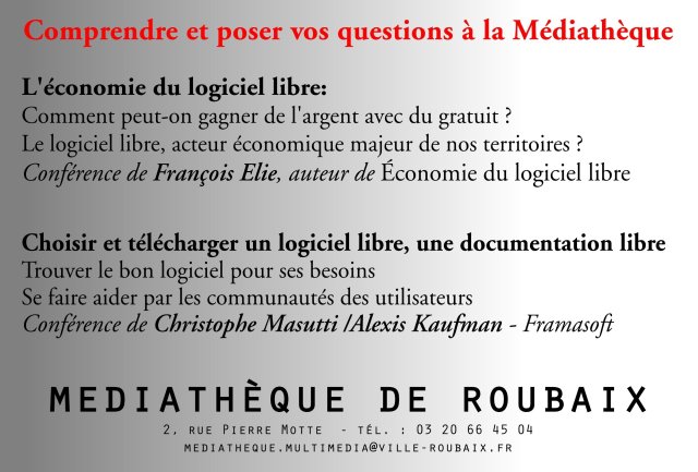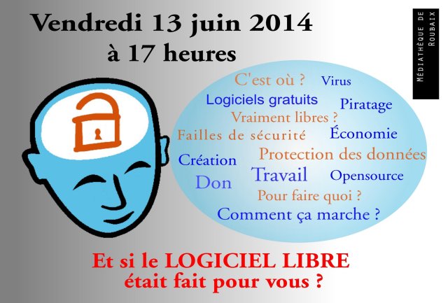 Le vendredi 13 juin 2014, à partir de 17h00, la Médiathèque de Roubaix organise une conférence consacrée au Logiciel Libre.