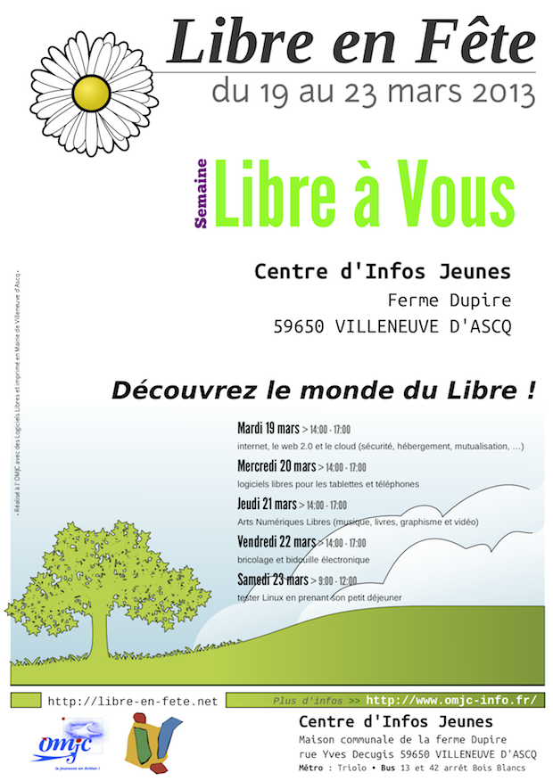 Dans le cadre de l’initiative nationale Libre en Fête, l’OMJC de Villeneuve d’Ascq, organise au CIJ (Centre d’Infos Jeunes) une semaine dédiée à la présentation du Libre dans l’informatique à destination de tous.