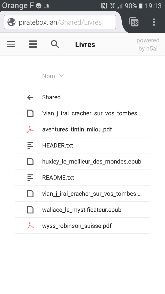 Il suffit ensuite de repérer le réseau wifi de la bibliobox (ou piratebox) avec un PC équipé d’une carte wifi ou d’un smartphone puis de s’y connecter avec un navigateur Web. Il suffit de taper http://piratebox.lan (ou un autre nom de domaine si vous l’avez modifié, mais toujours avec http:// devant) pour accéder à la page d’accueil de la bibliobox.