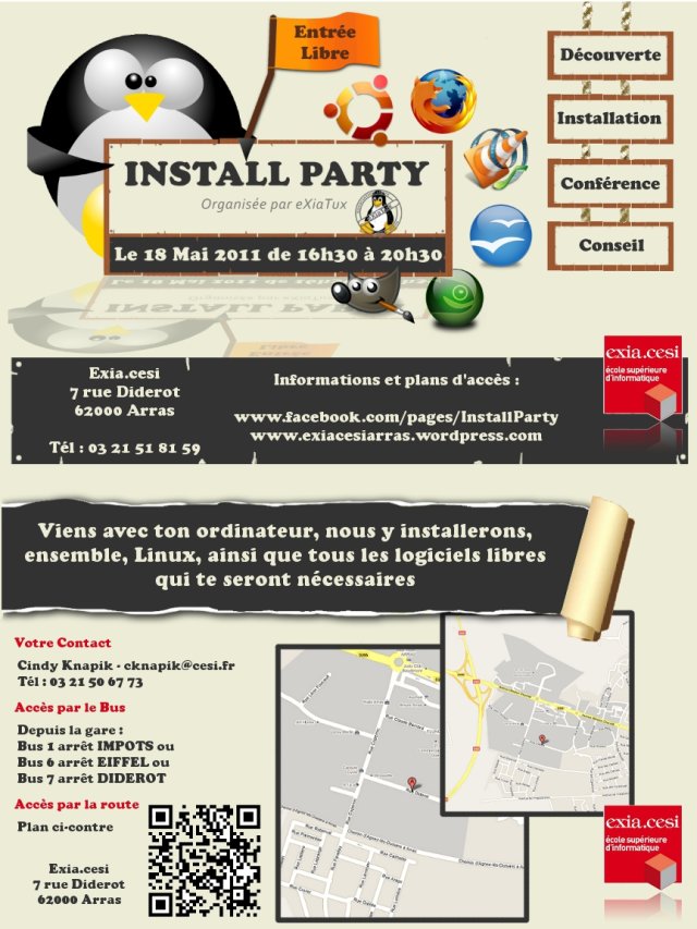 Le bureau des étudiants de l’exia.cesi d’Arras qui intègre un club d’utilisateurs de logiciels libres : eXiaTux, organise une install party le 18 mai 2011, de 16h30 à 20h30.