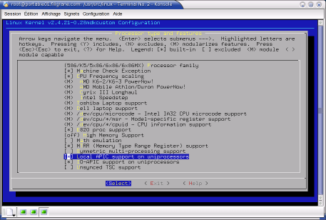 En parcourant les menus et sous-menus, à la recherche de notre LAPIC que l’on soupçonne de bloquer notre noyau, nous rencontrons des options que l’on sait inutiles pour notre PC portable : old cdrom driver, IEEE 1394 (pas de connecteur firewire sur cette machine), IRDA (pas d’infrarouge non plus)...