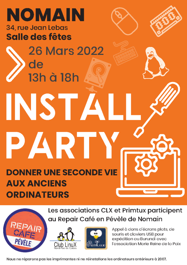 Les associations CLX et Primtux proposerons aux personnes de donner une seconde vie à leur ordinateur devenu obsolète (pc fixe ou portable sous windows xp, vista ou 7) avec l’installation d’un système libre, sécurisé disposant du nécessaire pour les usages de base (internet, bureautique, messagerie, retouche d’images...).